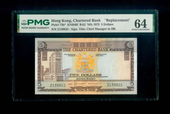 1975ND 香港渣打銀行 $5 PMG 64 編號:Z139922(補版系列)