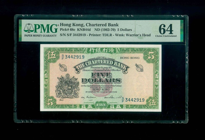 1962-70ND 香港渣打銀行 $5 PMG 64 編號:S/F 3442919(米拿簽名)