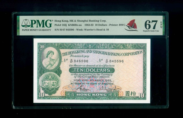 1983 香港上海滙豐銀行 $10 PMG 67 EPQ 編號:H/47 845596(頂級雪白)