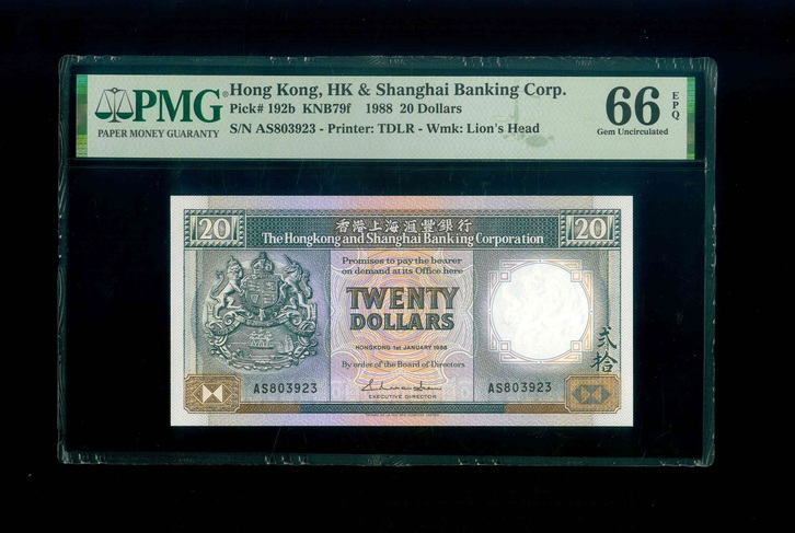 1988 香港上海滙豐銀行 $20 PMG 66 EPQ 編號:AS803923