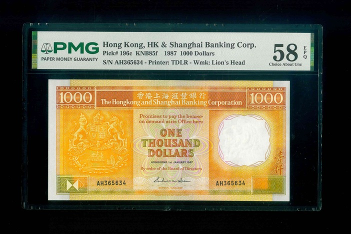 1987 香港上海滙豐銀行 $1000 PMG 58 EPQ 編號:AH365634