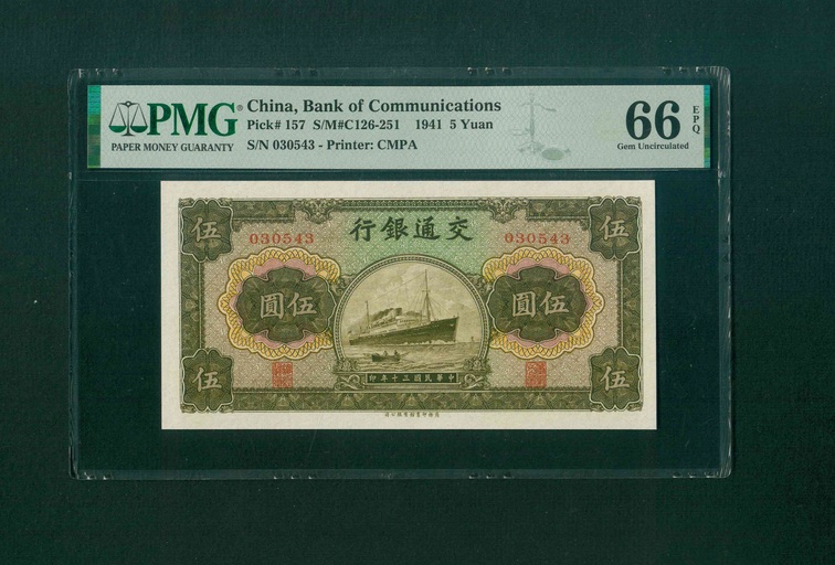 1941 交通銀行 $5 PMG 66 EPQ 編號: 030543(頂級雪白)