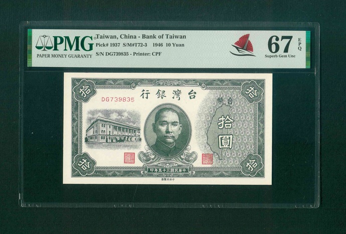 1946 台灣銀行 $10 PMG 67 EPQ 編號: DG739835(頂級雪白)