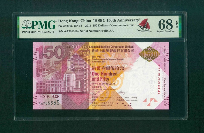 2015 香港上海滙豐銀行紀念鈔 $150 PMG 68 EPQ 編號: AA785565(頂級雪白)