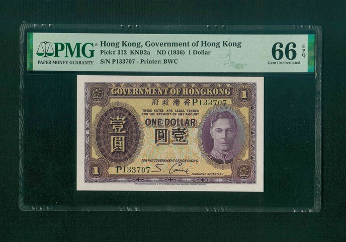 1936 香港政府 $1 PMG 66 EPQ 編號: P133707(頂級雪白)