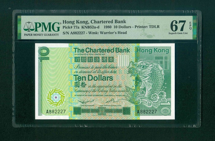 1980 香港渣打銀行 $10 PMG 67 EPQ 編號: A882227(頂級雪白)