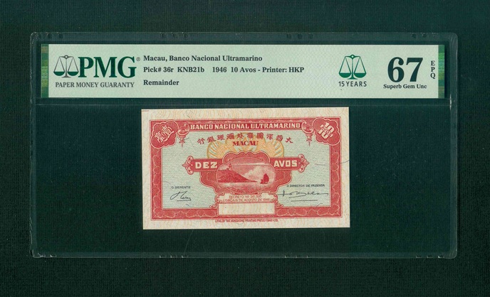 1946 澳門大西洋海外滙理銀行 10 Avos PMG 67 EPQ 編號:Remainder
