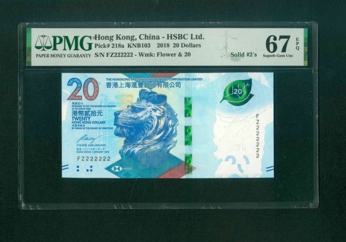 2018 香港上海滙豐銀行 $20 PMG 67 EPQ 編號:FZ222222(幸運全2,頂級雪白)