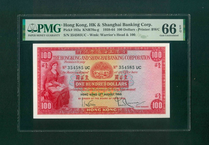 1959 香港上海滙豐銀行 $100 PMG 66 EPQ 編號:354585 UC(頭年版別)