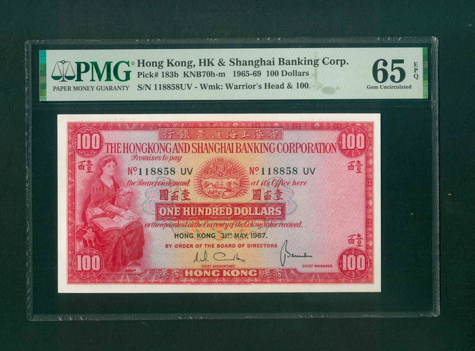 1967 香港上海滙豐銀行 $100 PMG 65 EPQ 編號:118858 UV