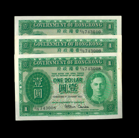 1952 香港政府 $1 UNC 編號:C/5 743008-10(共3張,連號)