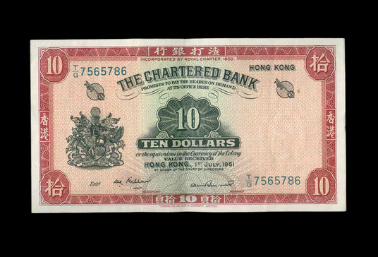 1961 香港渣打銀行 $10 EF 編號:T/G 7565786 (原裝)