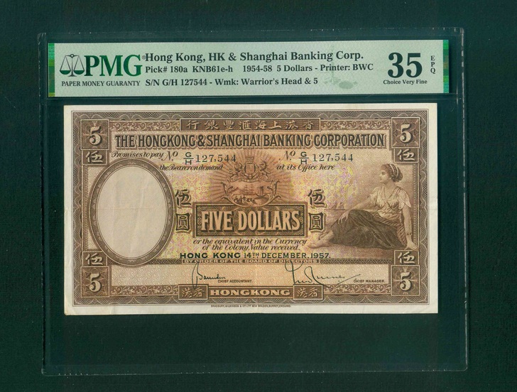 1957 香港上海滙豐銀行 $5 PMG 35 EPQ 編號:G/H 127544