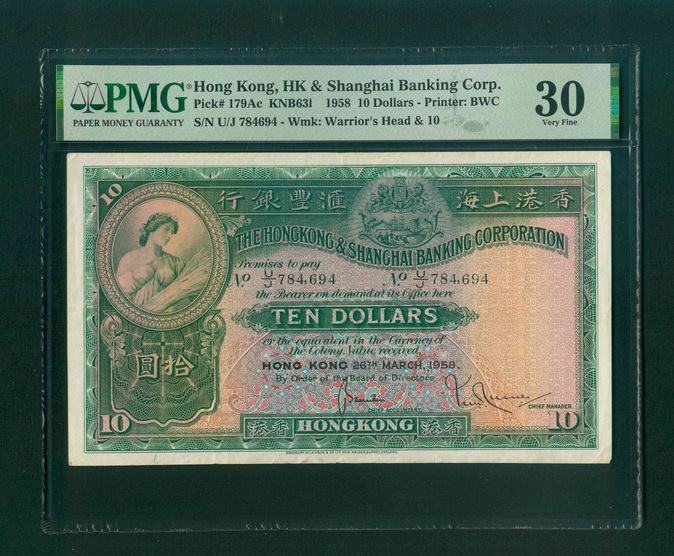1958 香港上海滙豐銀行 $10 PMG 30 編號:U/J 784694(紙胆系列)