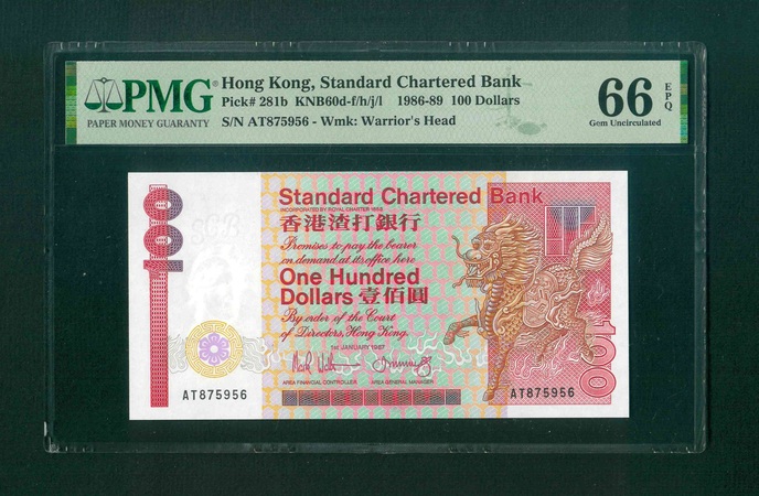 1987 香港渣打銀行 $100 PMG 66 EPQ 編號: AT875956(頂級雪白)