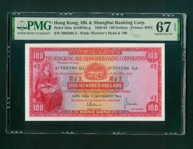 1964 香港上海滙豐銀行 $100 PMG 67 EPQ 編號: 708590 UJ