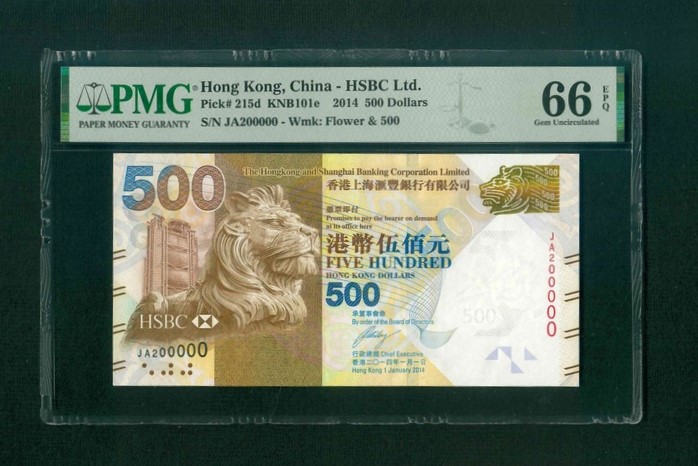 2014 香港上海滙豐銀行 $500 PMG 66 EPQ 編號: JA200000(20萬號,頂級雪白)