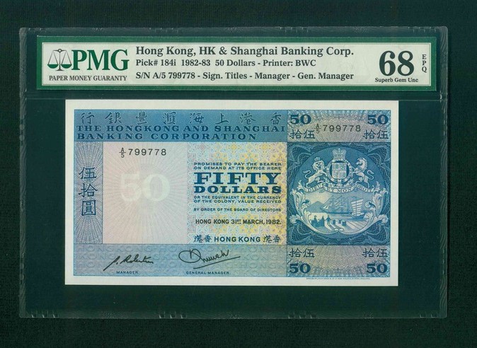 1982 香港上海滙豐銀行 $50 PMG 68 EPQ 編號: A/5 799778(頂級雪白)