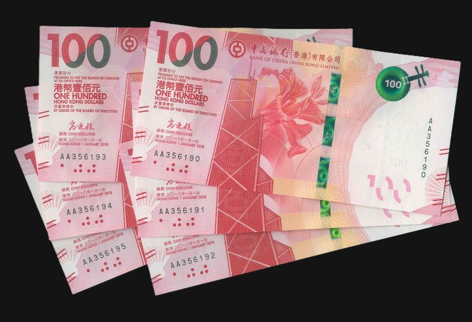 2018 香港中國銀行$100 UNC 編號: AA356190-195(頭版連號,頂級雪白,共6張)