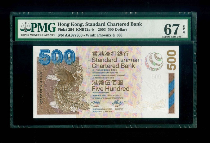 2003 香港渣打銀行$500 PMG 67 EPQ 編號: AA877866(頭版系列,頂級雪白)