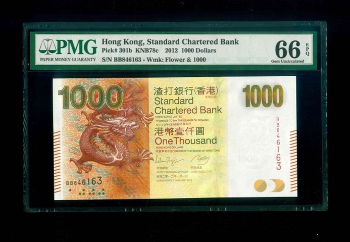 2012 香港渣打銀行$1000 PMG 66 EPQ 編號: BB846163(雙冠,頂級雪白)