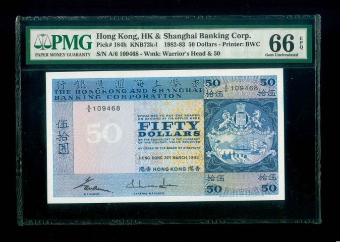 1983 香港上海匯豐銀行$50 PMG 66 EPQ 編號: A/6 109468(頂級雪白)