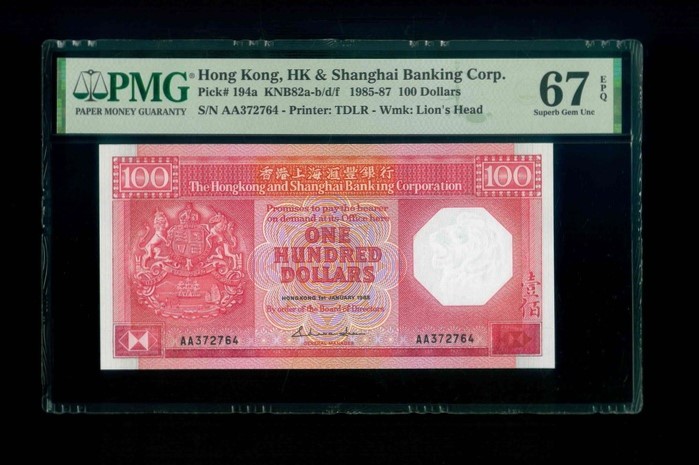 1985 香港上海匯豐銀行$100 PMG 67 EPQ 編號: AA372764(頭版系列,頂級雪白)
