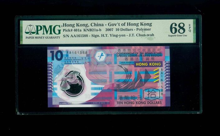 2007 香港特區政府 $10 PMG 68 EPQ 編號:AA161588(頭版88尾)