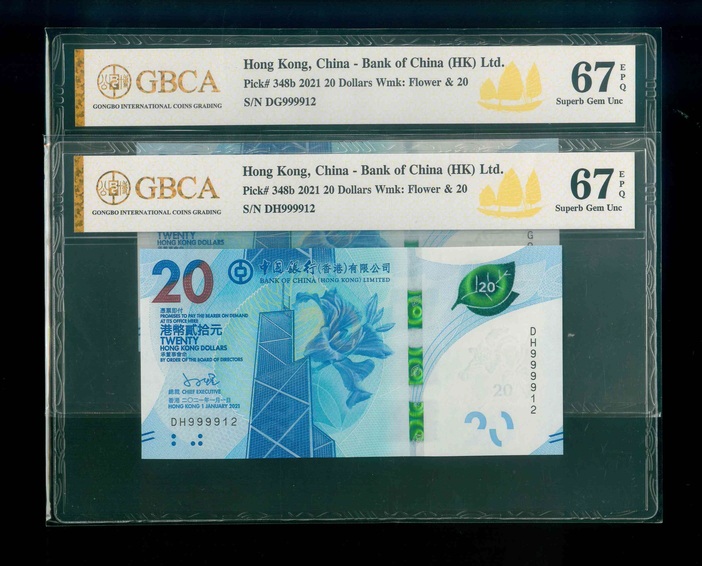 2021 香港中國銀行$20 GBCA 67 EPQ 編號: DG999912…(同號,頂級雪白,共2枚)