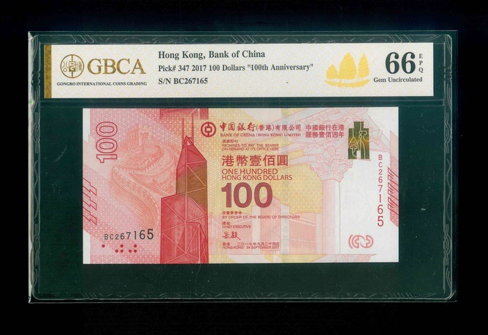 2017 香港中國銀行100周年紀念鈔$100 GBCA 66 EPQ 編號: BC267165(頂級雪白)