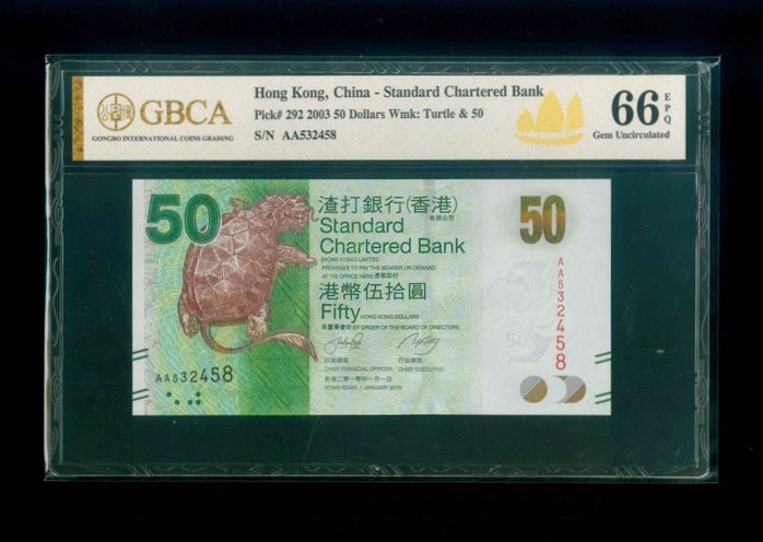 2003 香港渣打銀行$50 GBCA 66 EPQ 編號: AA532458(頭版系列,頂級雪白)