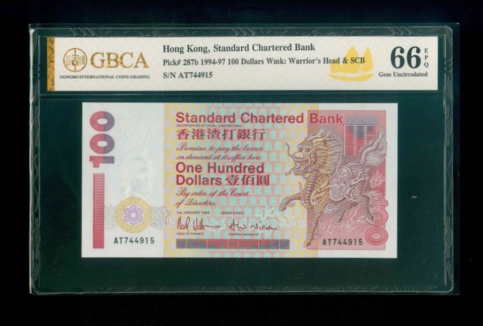 1994 香港渣打銀行$100 GBCA 66 EPQ 編號: AT744915(頂級雪白)