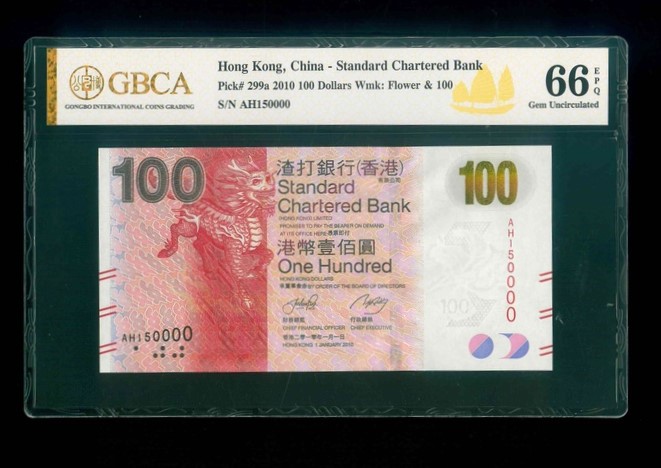 2010 香港渣打銀行$100 GBCA 66 EPQ 編號: AH150000(15萬號,頂級雪白)