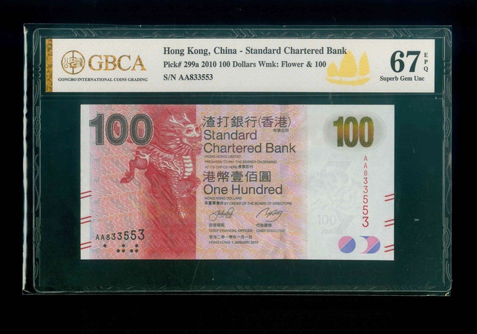 2010 香港渣打銀行$100 GBCA 67 EPQ 編號: AA833533(頭版系列,頂級雪白)