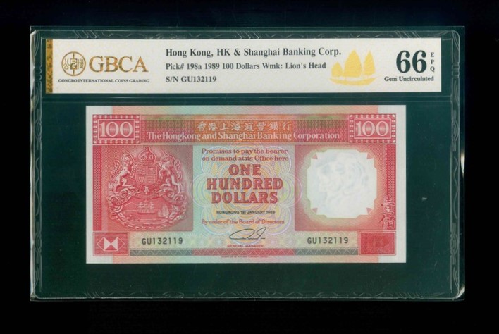1989 香港上海匯豐銀行$100 GBCA 66 EPQ 編號: GU132119(頂級雪白)