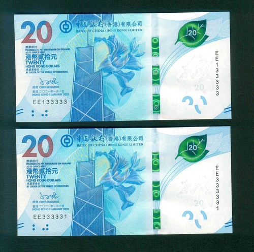 2021 香港中國銀行 $20 UNC 編號: EE133333/EE333331(共2張,趣味號,頂級雪白)