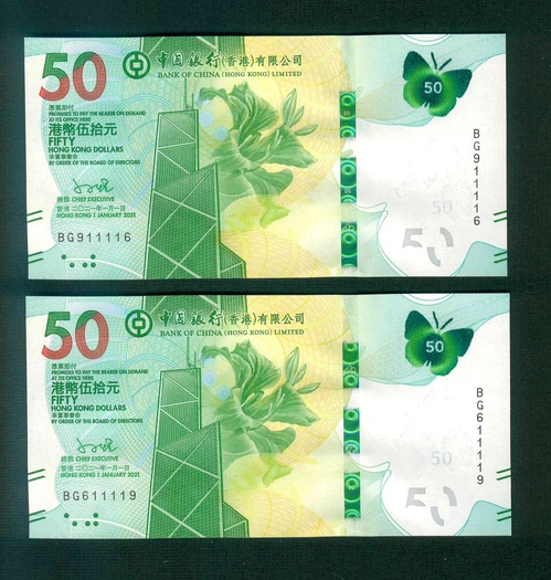 2021 香港中國銀行 $50 UNC 編號: BG911116/BG611119(共2張,趣味號,頂級雪白)