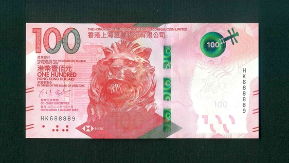 2022 香港上海滙豐銀行 $100 UNC 編號: HK688889(旋轉號,頂級雪白)
