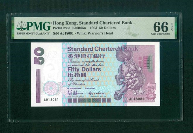 1993 香港渣打銀行 $50 PMG 66 EPQ 編號: A018081(頂級雪白)