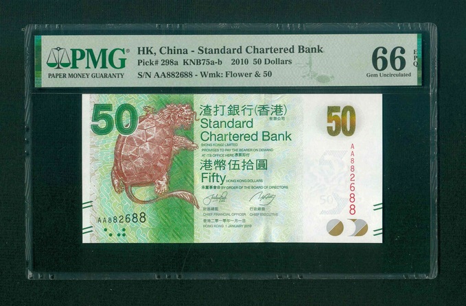 2010 香港渣打銀行 $50 PMG 66 EPQ 編號: AA882688(頭版系列,頂級雪白)