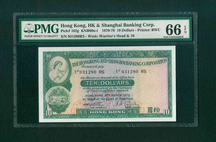 1972 香港上海滙豐銀行 $10 PMG 66 EPQ 編號: 931280 RS