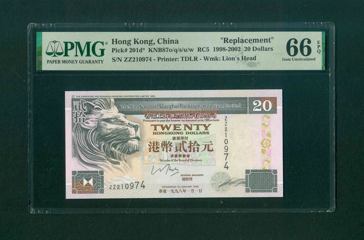 1998 香港上海滙豐銀行 $20 PMG 66 EPQ 編號: ZZ210974(補版系列)