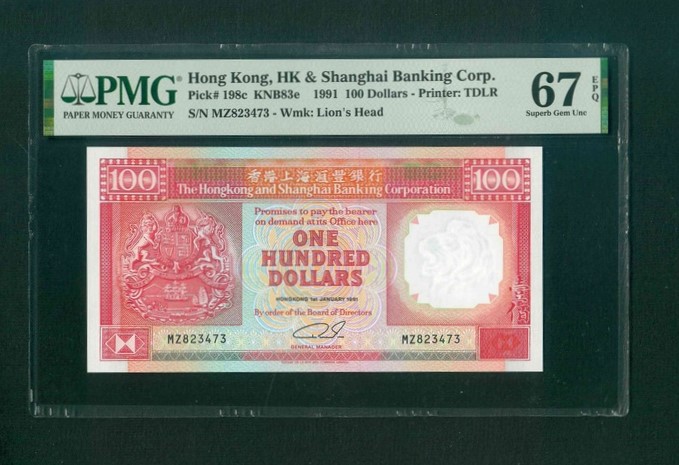 1991 香港上海滙豐銀行 $100 PMG 67 EPQ 編號: MZ823473(頂級雪白)