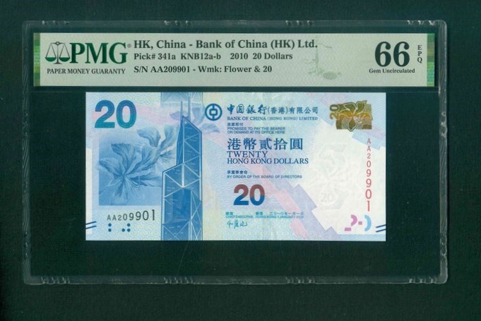 2010 香港中國銀行 $20 PMG 66 EPQ 編號: AA209901(頭版系列,頂級雪白)