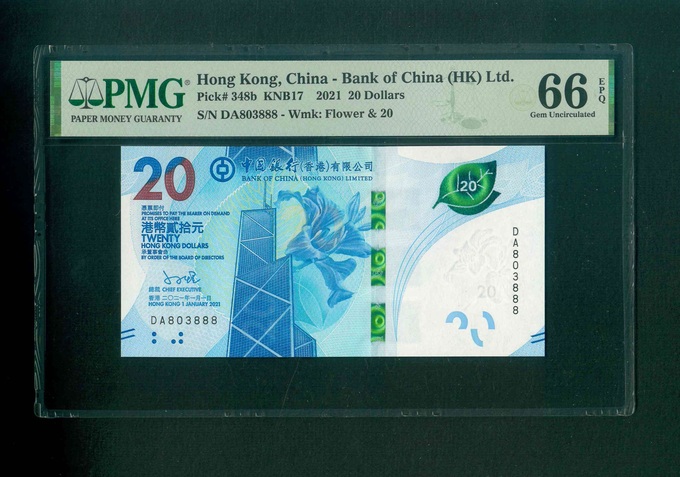 2021 香港中國銀行 $20 PMG 66 EPQ 編號: DA803888(豹子號,頂級雪白)