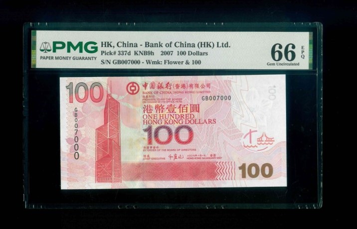 2007 香港中國銀行 $100 PMG 66 EPQ 編號:GB007000(7千號,頂級雪白)