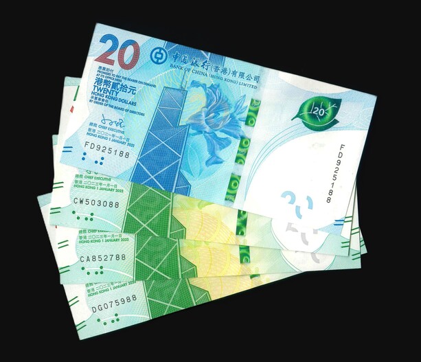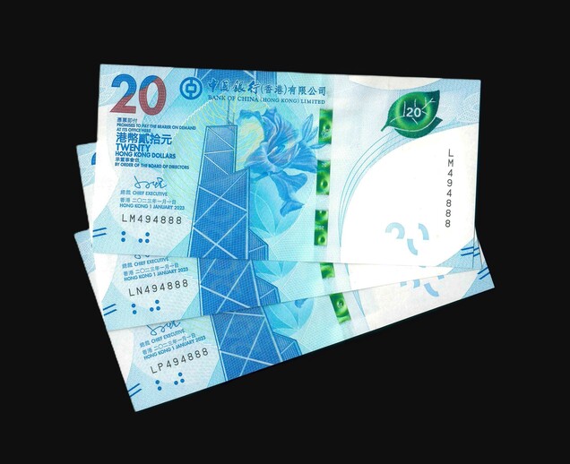 2023 香港中國銀行 $20 UNC 編號:LM494888…(共3張,豹子同號,頂級雪白)