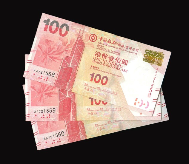 2010 香港中國銀行 $100 UNC 編號:AA721558-60(共3張,頭版連號,頂級雪白)