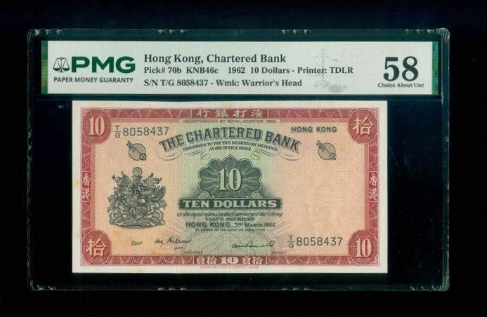 1962 香港渣打銀行 $10 PMG 58 編號:T/G 8058437