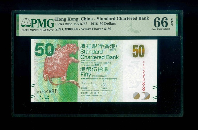 2016 香港渣打銀行 $50 PMG 66 EPQ 編號:CX309888(豹子號,頂級雪白)